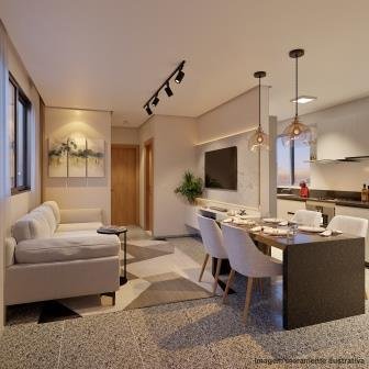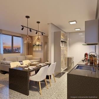 Áreas de 63 m² com sala de estar e jantar, cozinha e área de serviço interna.