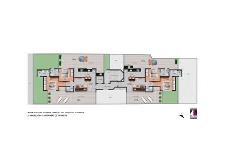 As coberturas possuem: 1° pavimento – 02 suítes e sala de estar. O 2° pavimento é composto de cozinha, sala de estar e jantar, 01 lavabo, área de serviço externa e terraço.